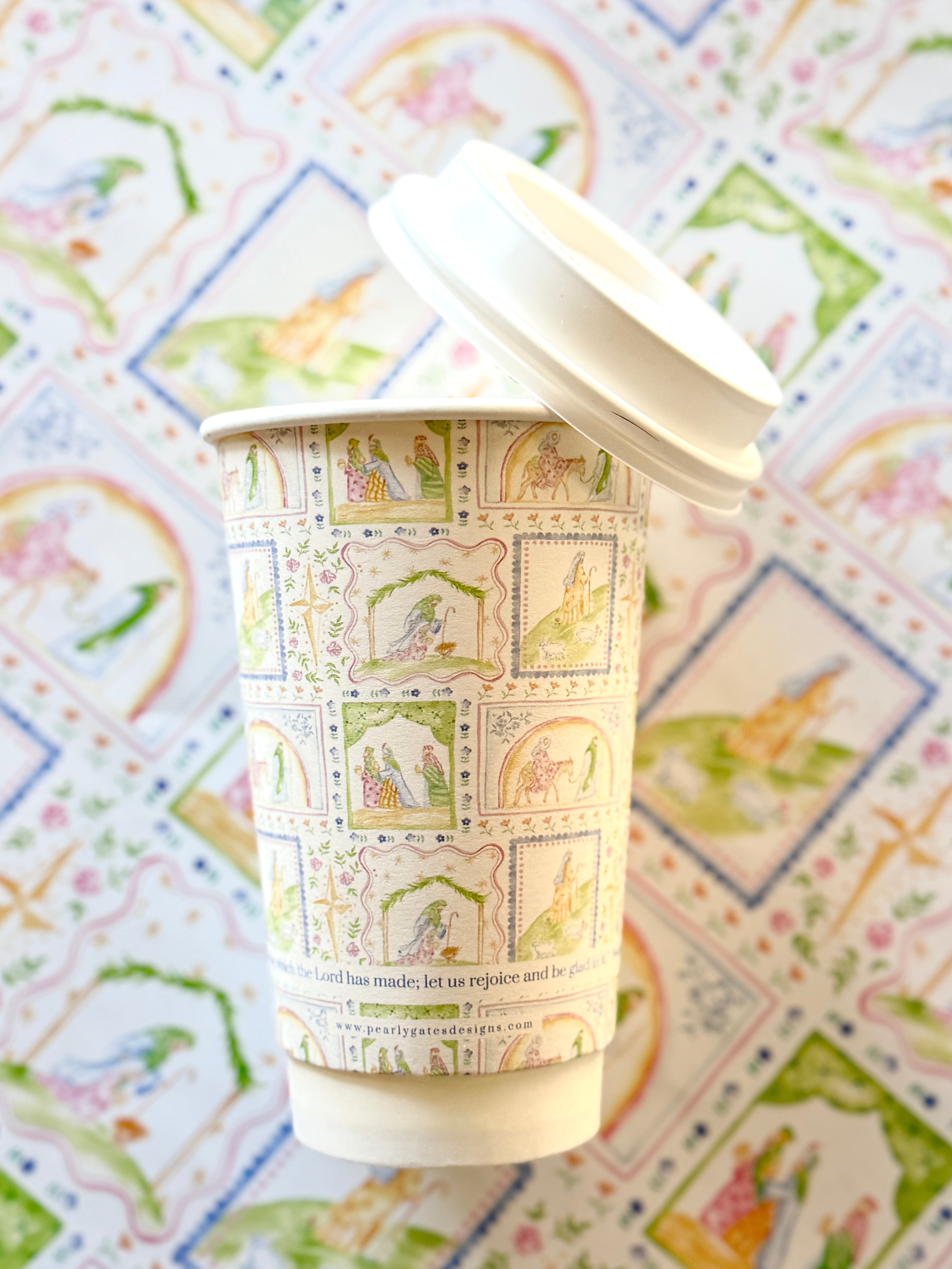 A cute coffee cup you can take on the go with you in our signature Journery to the Star design and a sweet verse to start the day on the bottom (Psalm 118:24).