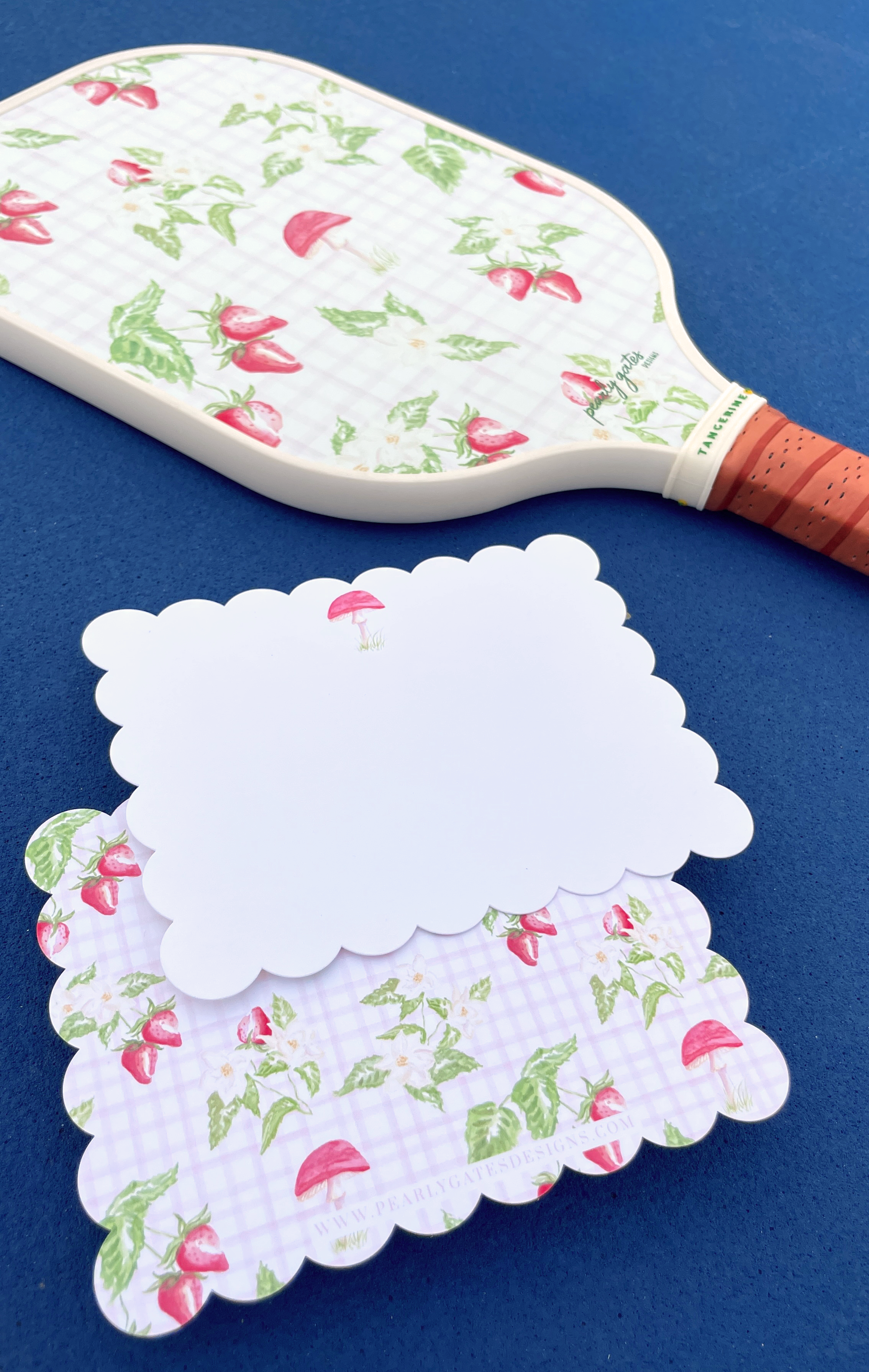 This design was hand painted with florals, strawberries and my favorite red cap mushrooms! It coordinates well with our Red Cap Pickle Ball Paddle.