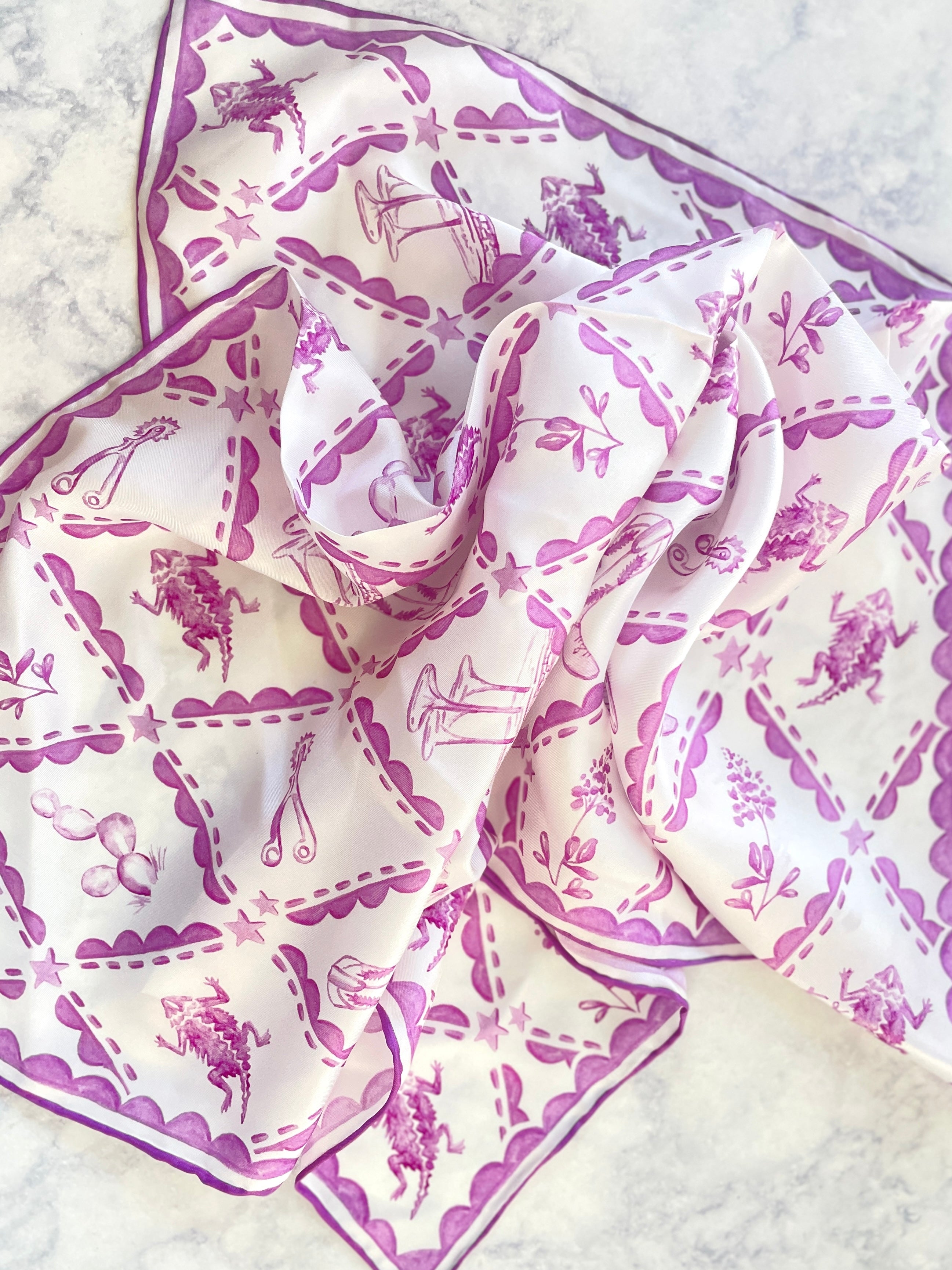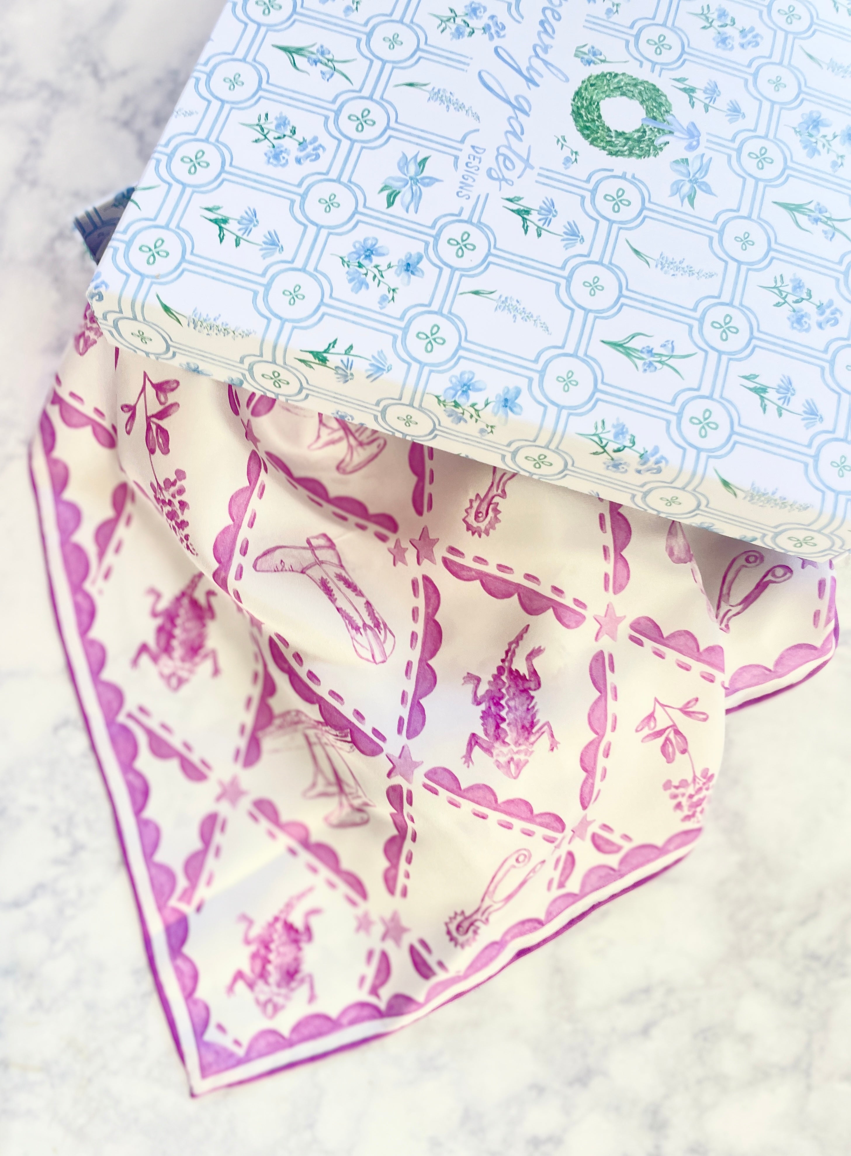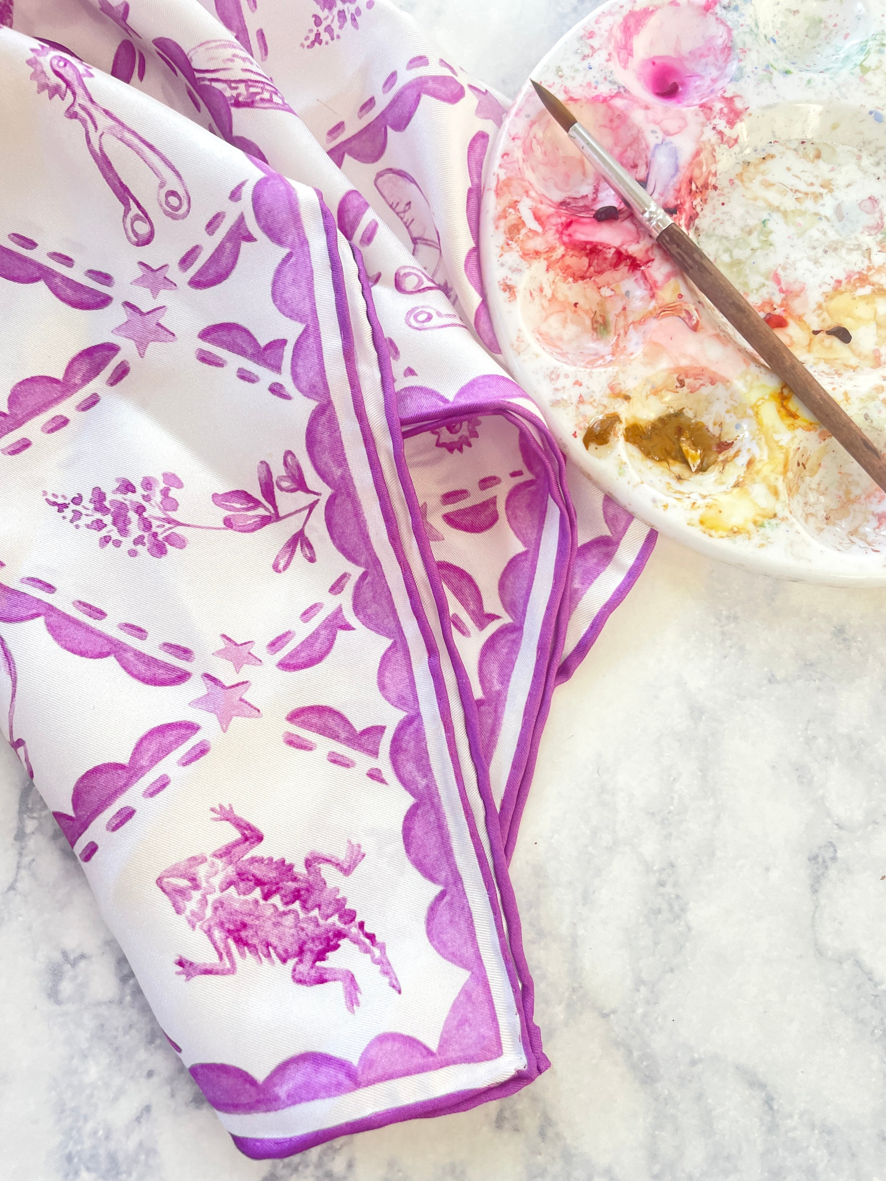 It is a fun accessory to tie in your ponytail or around your neck for a chic game of pickle ball! It is made with 100% silk and measures around 60x60cm. The edges are delicately rolled with a beautiful coordinating purple. Packaged in a keepsake Pearly Patterned Box!